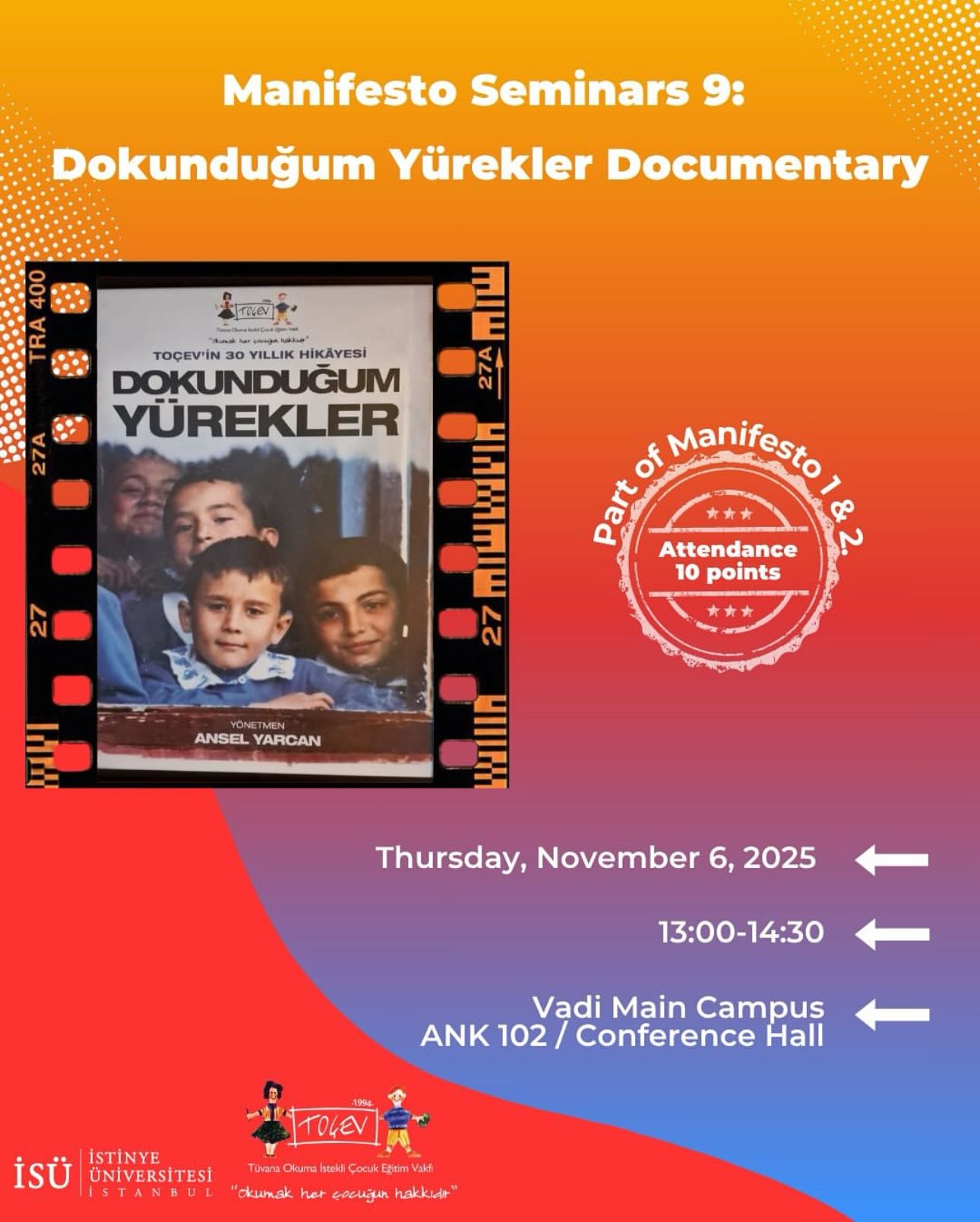 Manifesto Seminerleri serimizin dokuzuncu oturumunda, TOÇEV’in 30 yıllık hikayesini anlatan “Dokunduğum Yürekler” belgeselinin gösterimi ile sizlerleyiz.
