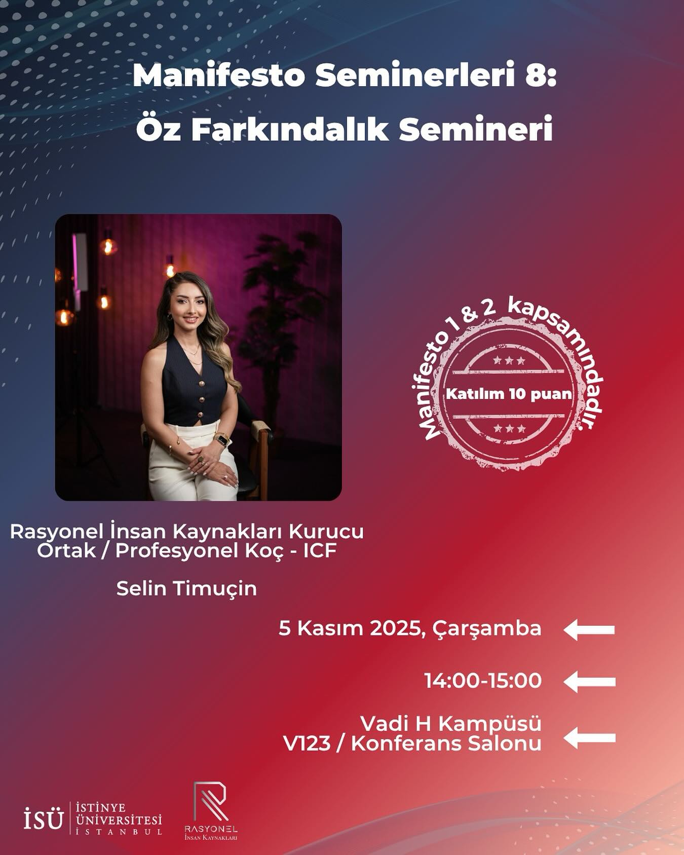 Rasyonel İnsan Kaynakları Kurucu Ortağı ve Profesyonel Koç (ICF) Selin Timuçin, bireysel gelişim ve farkındalık konularında deneyimlerini paylaşacak.