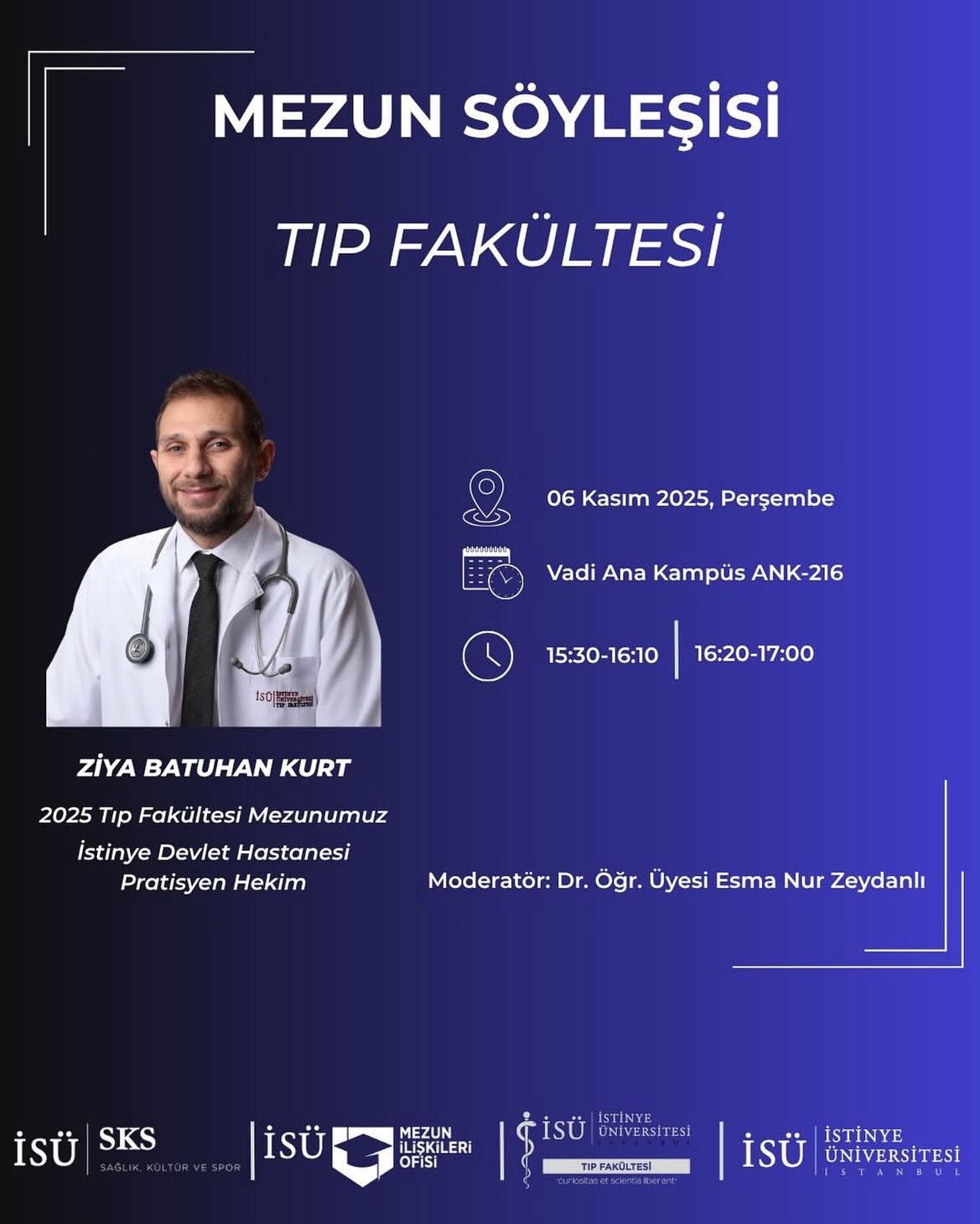 Kariyer Merkezi tarafından düzenlenen Mezun Söyleşisi kapsamında, 2025 Tıp Fakültesi mezunumuz Dr. Ziya Batuhan Kurt öğrencilerimizle bir araya geliyor.