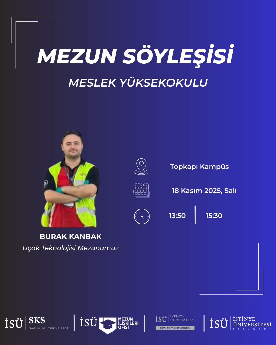 Kariyer Merkezi tarafından düzenlenen Mezun Buluşması kapsamında, Meslek Yüksekokulu Uçak Teknolojisi Programı mezunumuz Burak Kanbak öğrencilerimizle bir araya geliyor.