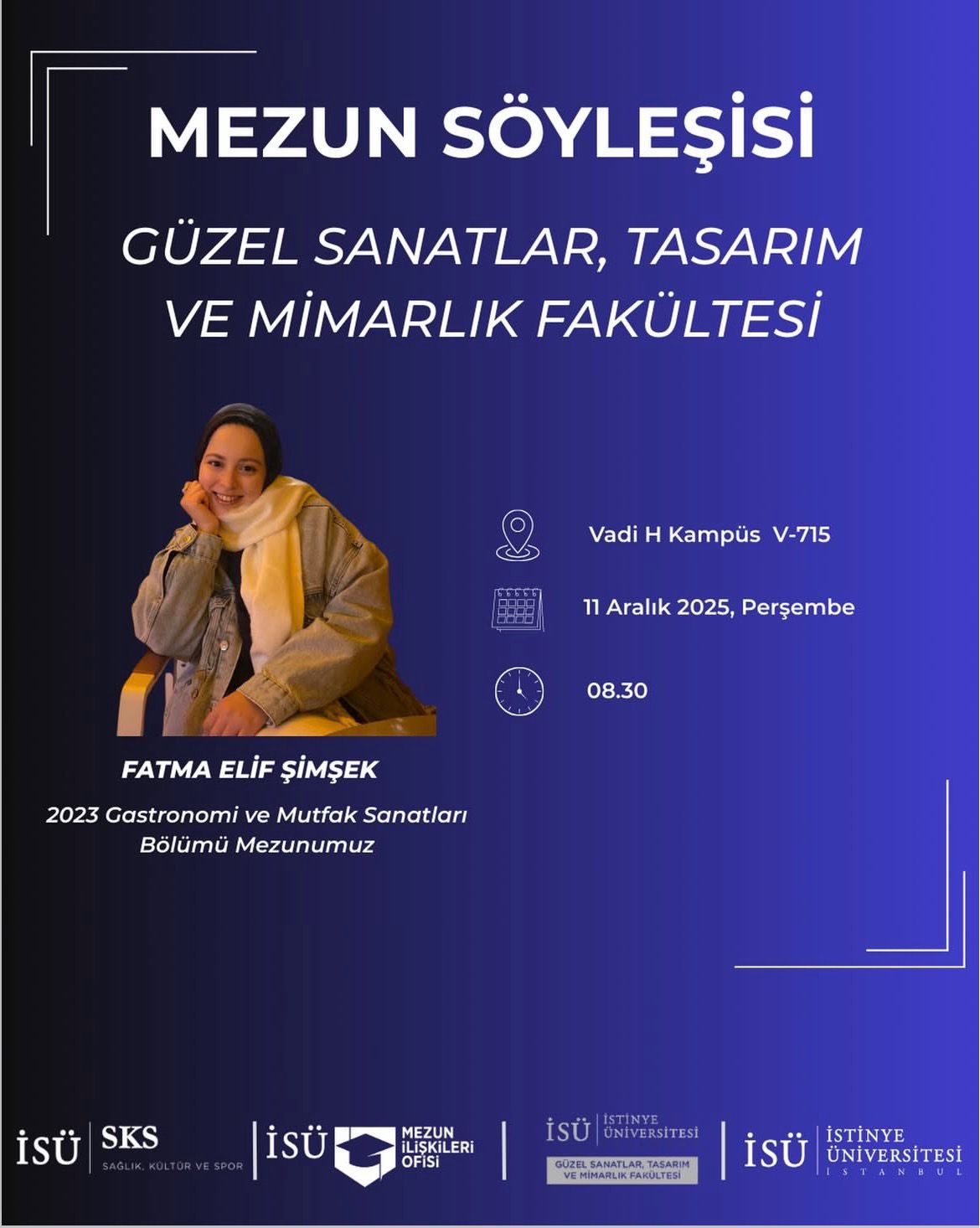 Kariyer Merkezi tarafından düzenlenen Mezun Söyleşisi kapsamında, 2023 Gastronomi ve Mutfak Sanatları mezunumuz Fatma Elif Şimşek öğrencilerimizle bir araya geliyor.